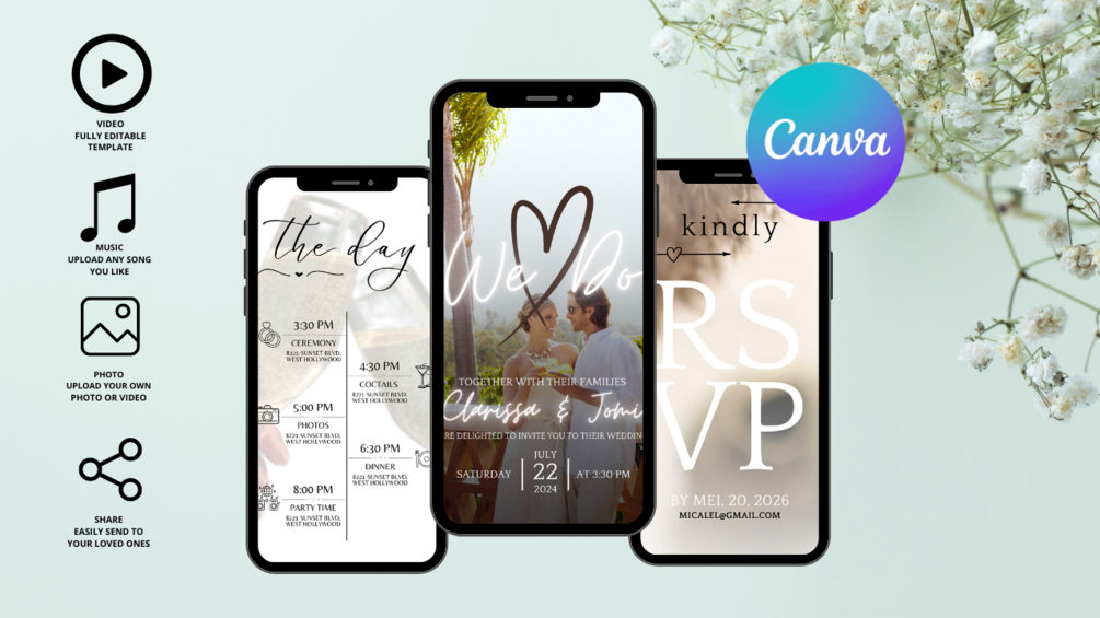 Forget the hassle of traditional invitation-making. Our Editable Evite allows you to design an enthralling and remarkable Digital Invitation for your special day. With easy customization, our Video Invite ensures your guests are mesmerized by this innovative and exceptional approach to wedding invites. Embrace the simplicity and elegance of a Minimalist Wedding or take advantage of the convenience of a Smartphone Evite, ensuring your Electronic Wedding invitation stands out.